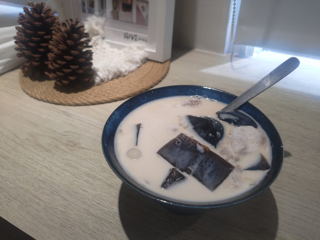澎湃豆花的白玉湯圓是傳統湯圓的白色那種,但是比較大顆和芋圓差不多,芋圓裡面還可以吃到芋頭顆粒,很香,黑糖粉粿的黑糖味不重不淡恰到好處,仙草也很香