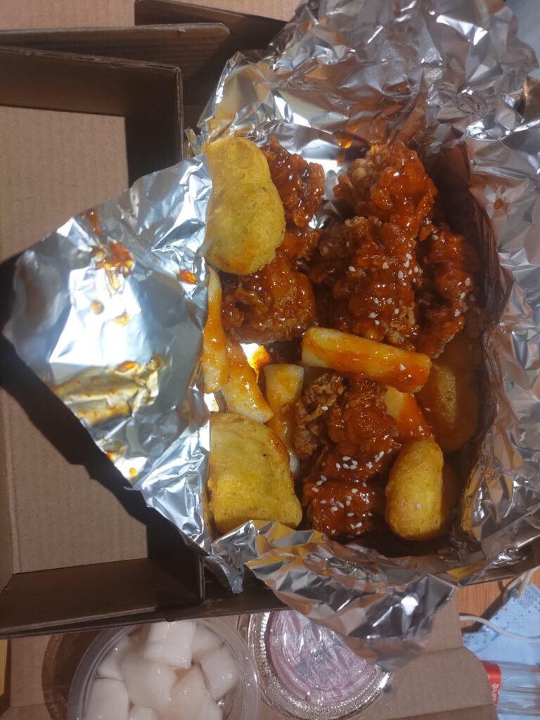 一打開整個食指大動,有炸雞.年糕.雞塊,而且份量我覺得很可以,年糕外皮酥脆,雞塊中規中矩,炸雞蠻嫩的,本身微酸微甜還蠻不錯的,我覺得算推薦