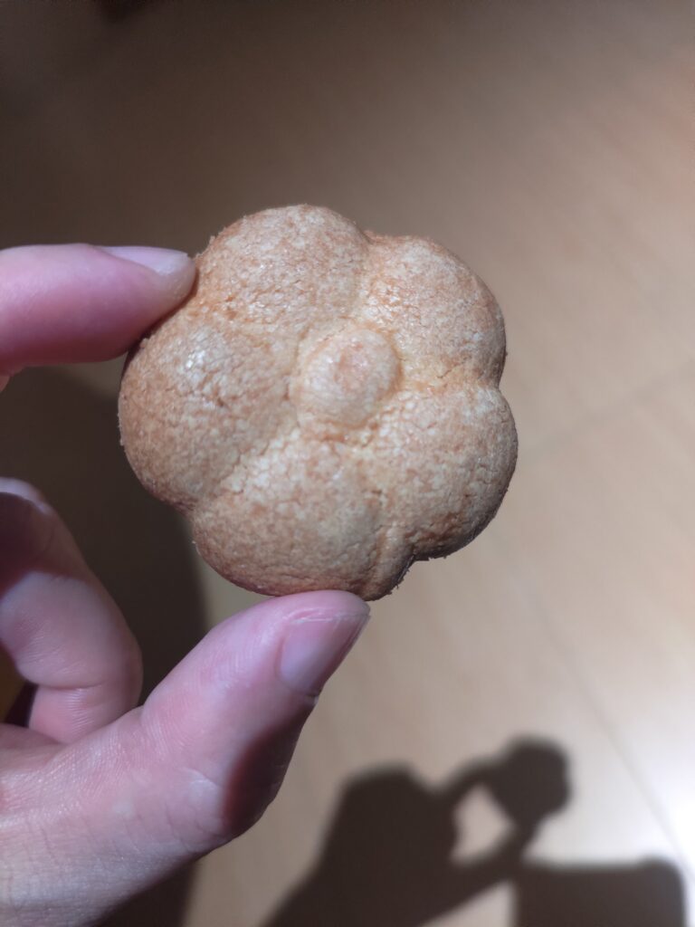 一個大小約3公分,吃起來是有點蓬鬆的口感,有時候可以吃到一些腰果的碎塊,味道不會太甜,吃起來沒有負擔感~感覺還不錯