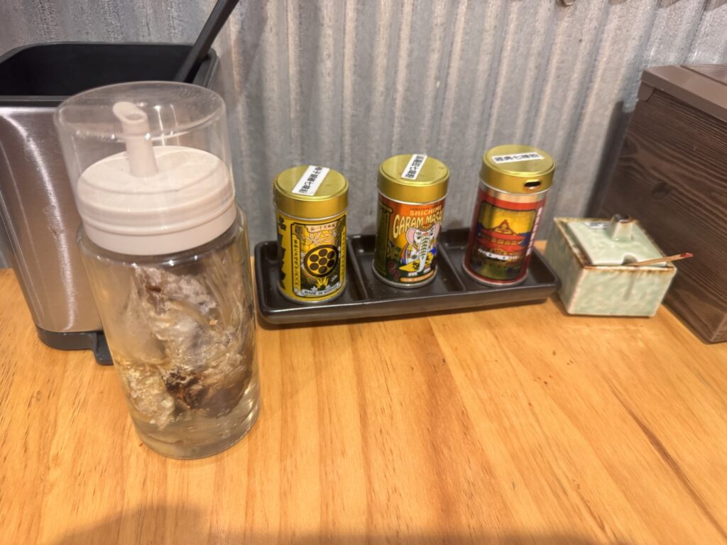 旁邊的調味料有柚子鹽胡椒(私心推),瑪莎拉七味粉(一加下去我懷疑我在吃的是咖喱拌麵),經典七味粉,還有用整條魚泡出來的類似魚露醋的味道(最左側)這個我有點不行