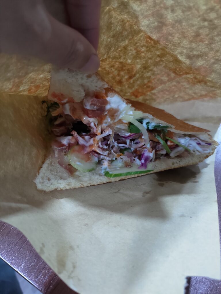 晚上跑去買了個點心,外觀有點像蔥油餅+酥炸銀絲卷,最外面餅皮還用熱壓機壓過,很酥脆,裡面餡料很多,小黃瓜,甘藍菜,雞肉洋蔥等加上熟悉的芥末醬,一份30000越南盾約台幣40元,很不錯
